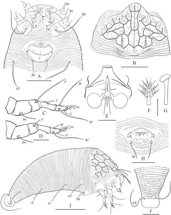 Drawings of Viginticus searsiae n. sp. (A)—coxigenital area, (B)—prodorsal shield, (C)—leg I, (D)—leg II, (E)—female internal genitalia, (F)—empodium I, (G)—tarsal solenidion I, (H)—male genital area, (I)—semilateral view of female, (J)—dorsal view of telosome. Scale bar: (A)—30 µm; (B)—40 µm; (C–E)—10 µm; (F,G)—3 µm; (H,J)—20 µm; (I)—70 µm.