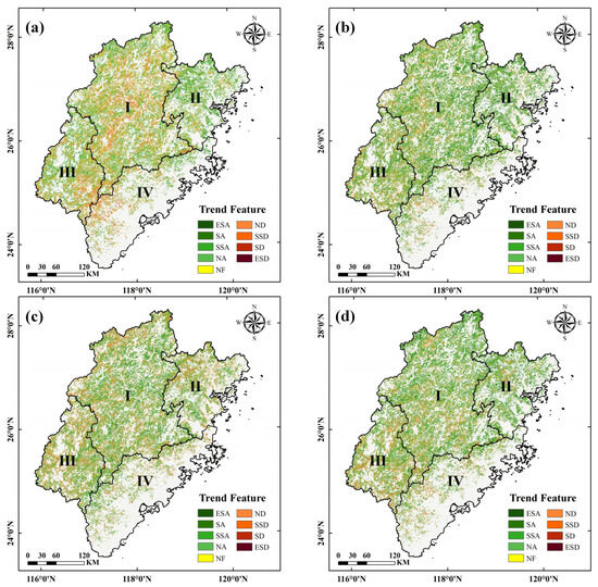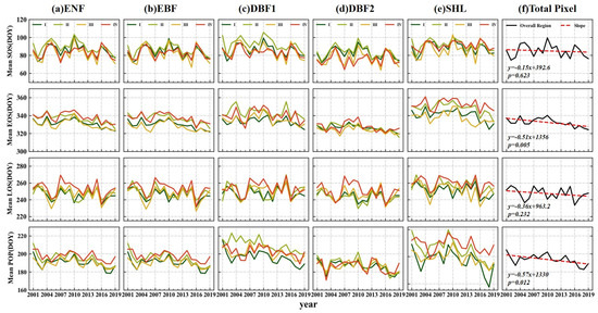 4.1. Spatiotemporal Variation Characteristics of Forest Phenological Parameters