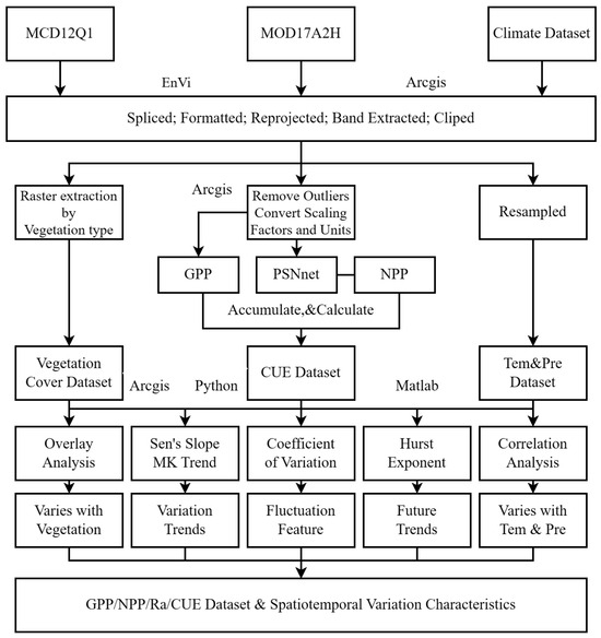 In recent academic discourse, researchers have extensively explored the estimation methodologies of carbon reservoirs. Traditional methods for estimating regional-scale carbon sinks primarily involve plot inventories, biomass models, micrometeorology, and integrated observations [8,9,10,11]. Strohbach et al. [12] employed the carbon footprint methodology to conduct a rigorous statistical analysis of the carbon sink capacity in newly established green spaces situated in Leipzig, Germany. Pan et al. [13] undertook a thorough and extended analysis of carbon sequestration in global forests, employing forest inventory data and advancing ecosystem carbon research over an extended temporal horizon. Fang et al. [14] implemented biomass models to evaluate fluctuations in China’s forest carbon reservoirs, mean carbon density, and carbon source–sink dynamics spanning the previous five decades. They formulated a comprehensive carbon cycling model for terrestrial ecosystems in China. Wu et al. [15] employed the method of continuous functions utilizing biomass conversion factors to ascertain the vegetation carbon stock within China’s natural forest reserves. Conventional methodologies frequently fall short in delineating the spatial distribution of vegetation carbon reservoirs, limiting their capability to discern the carbon sink status of an ecosystem solely based on aggregate quantities. Comprehensive, streamlined, expeditious, and precise methodologies for discerning carbon sinks are still in the nascent stages of advancement. In conjunction with the advancement of remote sensing techniques and advancements in geographic information technology (GIS), the pervasive integration of remote sensing datasets into models for estimating carbon sink dynamics has become prevalent. Vegetative Net Primary Productivity (NPP) is defined as the disparity between the overall Gross Primary Productivity (GPP) [16,17,18] of vegetation and autotrophic respiration (Ra). Here, Ra signifies the carbon quantity lost due to plant respiration, encompassing both plant growth respiration (Rg) and maintenance respiration (Rm). This parameter serves as a targeted descriptor for characterizing the carbon sequestration capacity of forest ecosystems. GPP [19,20], regarded as a pivotal parameter in carbon cycle investigations, accentuates the significance of vegetation in the context of carbon sequestration. This fundamental variable serves as a key indicator of the photosynthetic carbon assimilation capacity of ecosystems, contributing essential insights into their potential as carbon sinks. CUE, delineated as the quotient of NPP to GPP, emerges as a critical metric for assessing the carbon sequestration capacity of ecosystems. A higher CUE signifies a more robust carbon assimilation capacity and greater potential for carbon sequestration, contributing to carbon stability and long-term retention. Therefore, examining the variation and impact of ecosystem vegetation CUE is indispensable for evaluating the carbon sequestration capacity of regional ecosystems and devising management strategies to enhance the long-term carbon storage potential of ecosystems.