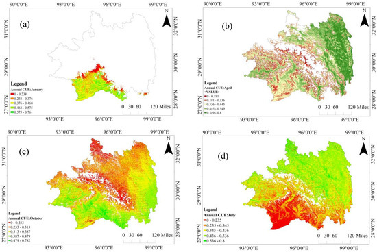 The monthly variations in CUE from 2012 to 2022 during typical months. (a) January, (b) April, (c) July, (d) October.