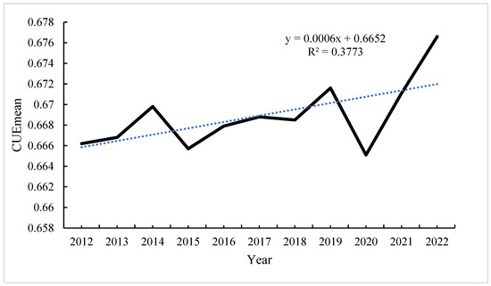 Illustrates the interannual variations in the annual average CUE from 2012 to 2022.