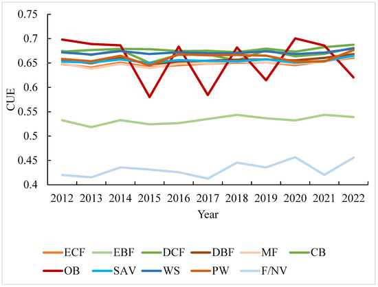 The interannual CUE mean values for various vegetation types from 2012 to 2022 (ECF: Evergreen Coniferous Forest, EBF: Evergreen Broadleaf Forest, DCF: Deciduous Coniferous Forest, DBF: Deciduous Broadleaf Forest, MF: Mixed Forest, CB: Closed Bush, OB: Open Bush, SAV: Savannah, WS: Woody Savannah, PW: Permanent Wetland, F/NV: Farmland/Natural Vegetation Mosaic).