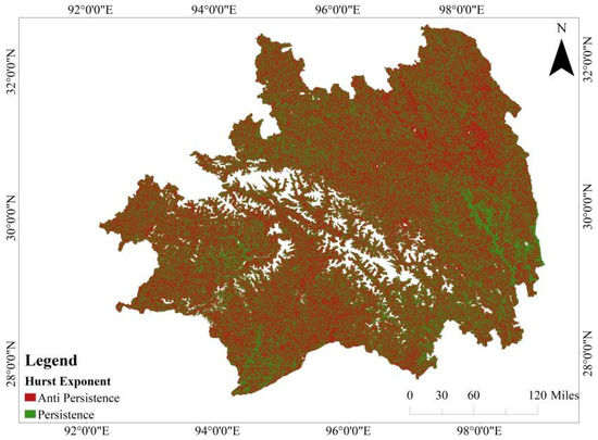 The outcomes derived from the application of the Hurst exponent method to scrutinize long-term persistent trends in CUE in Southeastern Tibet are presented in Figure 8. A substantial portion, approximately 75.95% of the region, displays a “counter-persistent” trend, suggesting that future variations are expected to oppose the current trends. In contrast, 24.05% of the region exhibits a “persistent” trend, indicating that future changes are likely to align with the existing trends. These areas are dispersed across various regions in Southeastern Tibet, with notable instances of robust “persistent” characteristics observed in the evergreen needleleaf forests in the southeast and west, as well as the evergreen broadleaf forests in southern Mêdog County.
