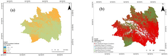 The partial correlation coefficients (a) and the accompanying significance test results (b) for the relationship between CUE and precipitation in the Southeastern Tibet region.