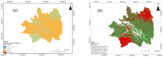 The partial correlation coefficients (a) and the accompanying significance test results (b) for the relationship between CUE and temperature in the Southeast Tibet region.