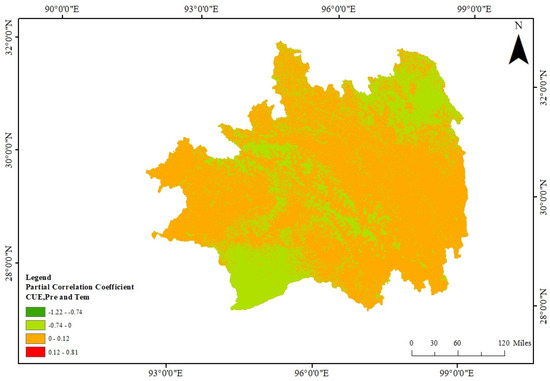 The partial correlation coefficients between CUE and precipitation–temperature in the Southeast Tibet region.
