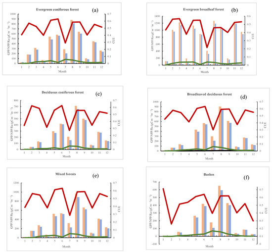 CUE fluctuations in other vegetation types appear similar, with an increase in CUE observed after each growing season. Deciduous coniferous forests, deciduous broadleaf forests, and evergreen coniferous forests (depicted in Figure 13a,c,d) manifest notably congruent ranges and patterns in GPP, NPP, Ra, and CUE. The progression of GPP/NPP/Ra follows a seasonal pattern, with the highest values occurring in summer, succeeded by spring and autumn, and the lowest levels recorded in winter. The apex of CUE consistently transpires in April–May, coinciding with a rapid increase in GPP/NPP levels. This leads to the speculation that these three vegetation types exhibit elevated carbon sequestration levels in the initial growth stages, ensuring energy balance throughout their lifecycle.