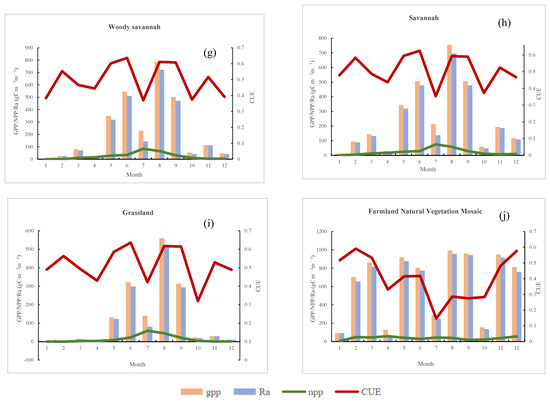 The seasonal variation in mean GPP/NPP/Ra/CUE for various representative vegetation types. (a) Evergreen coniferous forest, (b) evergreen broadleaf forest, (c) deciduous coniferous forest, (d) broadleaved deciduous forest, (e) mixed forests, (f) bushes, (g) woody savannah, (h) savannah, (i) grassland, (j) farmland natural vegetation mosaic.