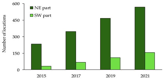 Number of localities of Aslepias syriaca L. in the north-eastern and south-western parts of the Deliblato Sands protected area during the seven-year period (2015–2021).