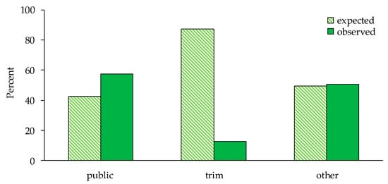 In Deliblato Sands, there are three types of selected inner roads where different human activities take place (Figure 2). In this study, we tested whether there are differences in the number of locations of invasive A. syriaca between these road types. The chi-square test for differences between public paved, trim and other inner roads confirmed significant differences in the number of locations (p < 0.0001, Table 2 (b)). A significantly lower number of locations than expected was detected on trim roads (Figure 4). Only 1% of the plants were found on about 8% of the roads belonging to the recreational trails (Figure 4). When comparing public paved and other inner roads, which do not include the recreational roads, it was found that significantly more than the expected number of locations (17%) were recorded on public roads (Figure 4), which comprise about 13% of all selected inner roads (p = 0.0044, Table 2 (b)). When comparing trim trails with other inner roads (excluding public paved roads), a significantly lower than expected number of locations were confirmed on trim trails (p < 0.0001, Table 2 (b)).