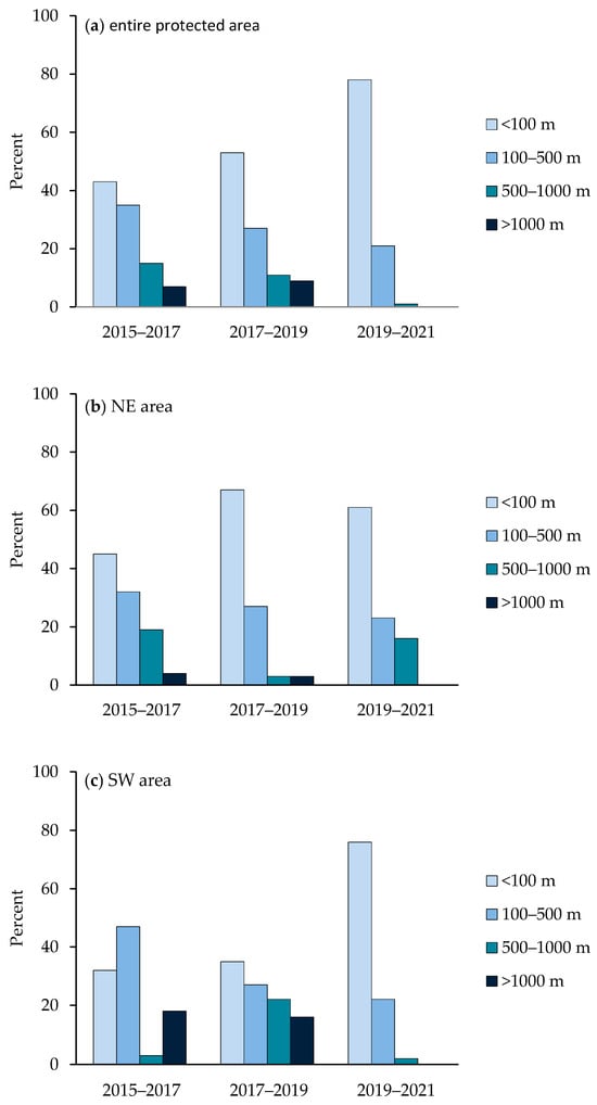It has been observed that new localities do not occur uniformly in Deliblato Sands, i.e., that there are large differences in distance between new and established colonies. Distances between newly established plants and existing colonies ranged from a few metres to over 3 km. Distances of up to 100 m were the most common, and distances of over 1000 m accounted for the smallest proportion (Figure 5a). Over the course of seven years, this trend became more and more pronounced. With each subsequent measurement, the frequency of distances up to 100 m increased, while the frequency of distances of 100–500 m, 500–1000 m and distances of more than 1000 m decreased. Distances between new and existing locations were also analysed separately for the north-eastern and south-western halves of Deliblato Sands. In the north-eastern part, the data show a similar trend to the analysis carried out for the whole protected area, with the frequency of distances up to 100 m being highest throughout the period and increasing year to year over the measured period (Figure 5b). In the south-western part, the proportion of distances between locations of up to 100 m also increased (Figure 5c). The difference was that, in the south-western part between 2015 and 2017, the largest proportions had distances between 100–500 m (Figure 5c). In addition, the frequency of distances over 1000 m was significantly higher in the south-western part (almost 20%) than in the north-eastern part (less than 5%).