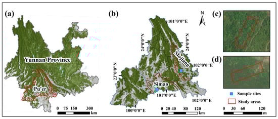 The location of clear-cutting sample plots. (a,b) show the location of the plantation sample plots in Simao district and the natural stand sample plots in Mojiang County of Pu’er City, Yunnan Province, China. (c) is a satellite image of the natural stand site, and (d) is a satellite image of the plantation site.