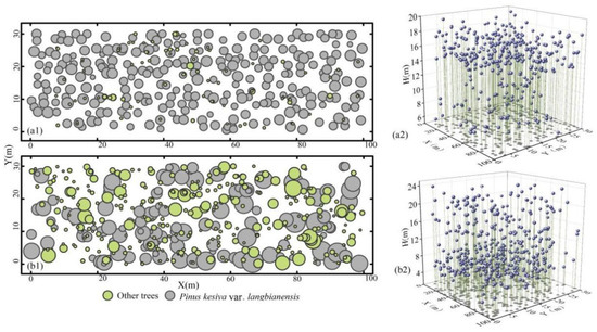 Sample plot schematic. (a1) is the DBH distribution in plantation, and (b1) is the DBH distribution in natural stand, where bubble size is proportional to DBH. (a2) is the distribution of H in the plantation, and (b2) is the distribution of H in the natural stand, where H (m) is the height of trees, while X (m) and Y (m) are the boundaries of sample plots.