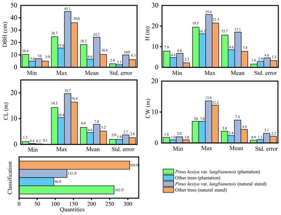 The plantation sample site (100°41′46.63″ E–22°35′48.91″ N) has an average annual temperature of 19.3 °C and an average annual rainfall of 1442.2 mm. The natural stand sample site (101°29′14.40″ E–23°09′58.20″ N) has an average annual temperature of 18.2 °C and an average annual rainfall of 1322.7 mm. Both plantation and natural stand plots are located in the subtropical monsoon zone with warm, rainy summers and relatively dry winters. The soil types are both yellow loam and middle-aged forests. The site conditions and stand structure are the same, and they can represent the same forest type in the region. To obtain basic data by tree component for individual trees, we set up a 30 × 100 m sample plot in both the plantation and natural origin stands. The coordinates of the living trees in the sample plot were recorded in detail, starting from the southwest corner of each sample plot (Figure 2), and then all the trees in the sample plot were cut down in April and May 2015. Comprehensive data on species, diameter at breast height (DBH), tree height (H), crown length (CL), and crown width (CW) were recorded for trees with a DBH of more than 5 cm (Figure 3). The plantation consisted of 358 trees with a total of 12 species. It was mainly dominated by Pinus kesiya var. langbianensis species, and there were also Castanopsis delavayi, Schima wallichii, Ficus hispida, and Phyllanthus emblica species growing in the forest stand. There were a total of 437 trees in the natural stand, with a total of 38 tree species. These were mainly Pinus kesiya var. langbianensis, Schima wallichii, Eurya japonica, Quercus delavayi, Alnus nepalensis, Phyllanthus emblica, and other species growing in the natural stand.