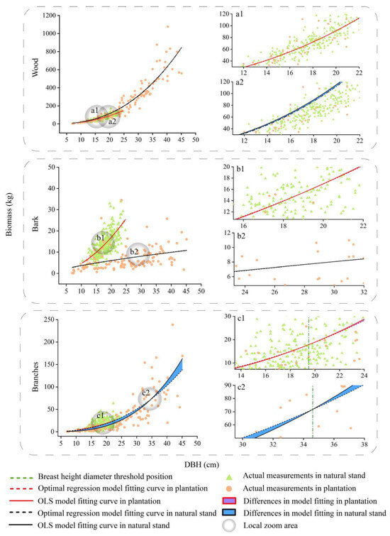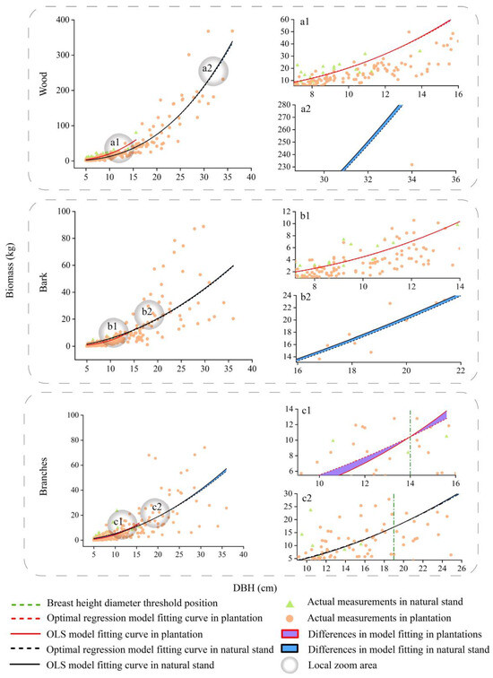 Fitting curves of the basic model and optimal spatial regression model for the wood, bark, and branch biomass of other trees. a1 and a2 are localised enlargements of wood from plantation and natural stand. b1 and b2 are localised enlargements of bark from plantation and natural stand. c1 and c2 are localised enlargements of branches from plantation and natural stand.