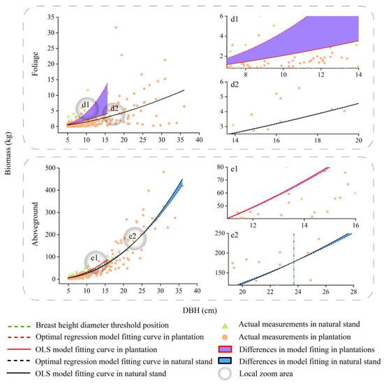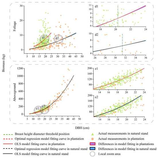 Fitting curves of the basic model and optimal spatial regression model for the foliage and aboveground biomass of other trees. d1 and d2 are localised enlargements of foliage from plantation and natural stand. e1 and e2 are localised enlargements of aboveground biomass from plantation and natural stand.