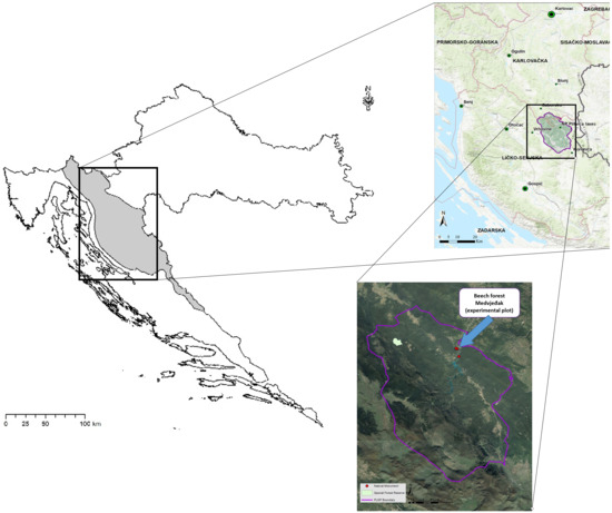 - Anić, I. The Influence of Stand Structure and Regeneration on the Sustainability of Fir-Beech and Beech Forests in the National Park Plitvice Lakes. 2007. Available online: http://bib.irb.hr/datoteka/326894.Microsoft_Word_-_plitvice_2006_konacno_izvj.pdf (accessed on 15 November 2023).