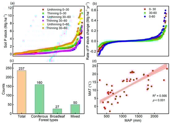 The distribution of the soil phosphorus (P) stock and the soil P stock change rate after thinning are shown in Figure 1a,b. In total, 237 data points were included in this study, including 160 coniferous, 27 broadleaf, and 50 mixed forest data points (Figure 1c). In addition, there was a significant positive correlation between MAT and MAP (Figure 1d).
