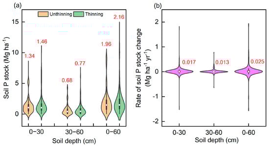 The effects of thinning on the soil phosphorus (P) stock at different soil depths (a) (n = 237) and on the rate of soil P stock change at different soil depths (b). Note: the numbers in the figure represent the mean of the soil P stock or rate of soil P stock change.
