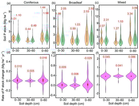 In terms of the different forest types, thinning increased the soil P stock in coniferous, broadleaf, and mixed forests (except for the 0–60 cm soil layer in the broadleaf forest) (Figure 3). The soil P stock in the 0–30, 30–60, and 0–60 cm soil layers of the coniferous forest increased by 8.9, 11.4, and 9.7%, respectively (Figure 3a); those in the broadleaf forest increased by 3.5, 4.0, and −1.2%, respectively (Figure 3b); and those in the mixed forest increased by 11.6, 20.5, and 15.0%, respectively (Figure 3c). The soil P stock change rates of the 0–30, 30–60, and 0–60 cm soil layers in the coniferous forest were 0.010, 0.005, and 0.016 Mg ha−1 yr−1, respectively (Figure 3d); those in the broadleaf forest were 0.009, 0.008, and −0.029 Mg ha−1 yr−1, respectively (Figure 3e); and those in the mixed forest were 0.045, 0.041, and 0.086 Mg ha−1 yr−1, respectively (Figure 3f). In addition, the soil P stock and soil P stock change rate of the mixed forest were higher than those of the coniferous and broadleaf forests, and those in the 0–30 cm soil layer were higher than those in the 30–60 cm soil layer (Figure 3a–f).