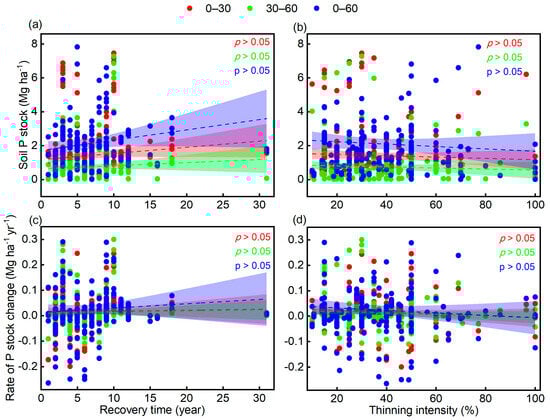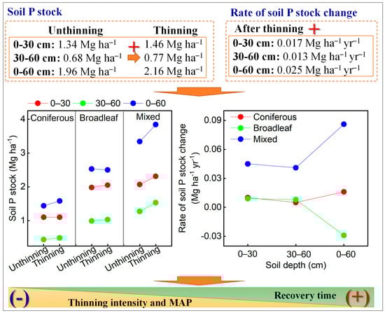 In this study, forest types were grouped into coniferous, broadleaf, and mixed forests. Regression analysis was used to assess the relationship among recovery time, thinning intensity, and MAP with soil P stock and soil P stock change rates.