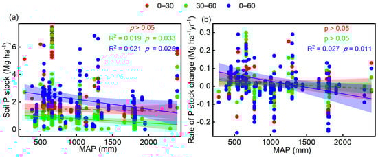 By exploring the relationship among soil P stocks and soil P stock change rates, and the recovery time and thinning intensity, we observed that the soil P stocks and soil P stock change rates in the 0–30, 30–60, and 0–60 cm soil layers exhibited an increasing trend with recovery time and a decreasing trend with thinning intensity (Figure 4a–d). Simultaneously, the soil P stocks and soil P stock change rates in the 0–30, 30–60, and 0–60 cm soil layers decreased with an increasing MAP (Figure 5a,b).