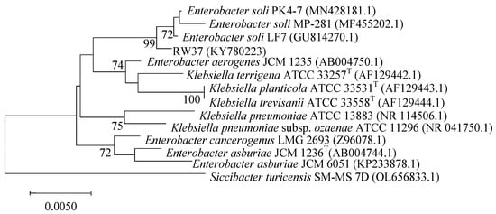 The 16S rRNA gene sequence of the isolated strains was submitted to GenBank under accession number KY780223 for RW37. The RW37 strain yielded a 1438 bp 16S rRNA gene fragment. A phylogenetic tree was constructed on the basis of alignment results that were compared with available data in GenBank (Figure 2), which revealed a high degree of similarity (99%) with Enterobacter soli. Therefore, the RW37 strain was identified as E. soli.