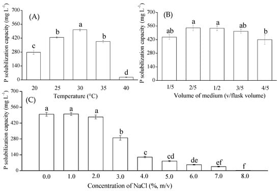 Effects of environmental factors on phosphate solubilization by the RW37 strain. (A): Temperature; (B): Volume of medium; and (C): Concentration of NaCl. Note: Different letters indicated significant differences among treatments at 0.05 level.
