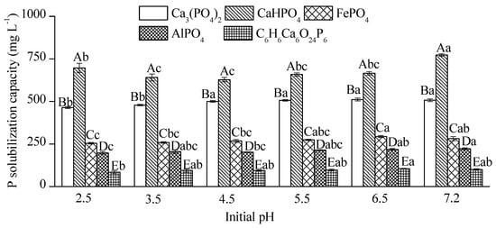 The solubilizing capacity of the RW37 strain with five P sources under different initial pHs. Note: The uppercase indicated the differences (p < 0.05) among the five P sources within the same initial pH and the lowercase indicated the differences (p < 0.05) among the initial pH within the same P sources.