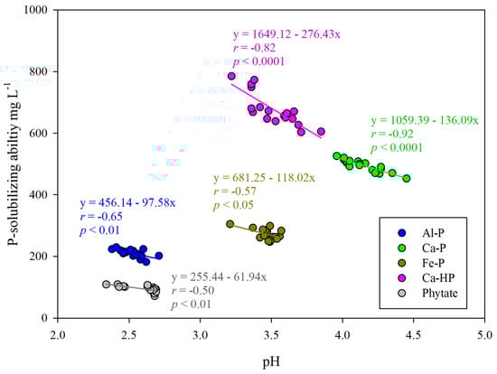The Pearson correlations between the pH of the fermentation broth and P-solubilizing capacity of RW37 with five different insoluble P sources (Al-P: AlPO4; Ca-P: Ca3(PO4)2; Fe-P: FePO4; Ca-HP: CaHPO4).