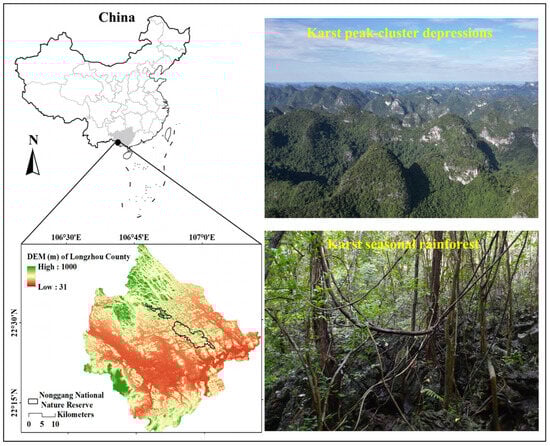The study site is located in the Nongang National Nature Reserve, Longzhou County, Guangxi Province, southwestern China (22°13′56″–22°39′09″ N, 106°42′28″–107°04′54″ E) (Figure 1). The forest in this reserve has remained almost undisturbed by humans for over a century and thus preserves the most pristine karst seasonal rainforest in China and even globally []. The terrain consists of typical karst peak-cluster depressions, composed of clustered mountain peaks and funnel-shaped landscapes with a common base (Figure 1). The elevation ranges from 150 to 600 m. The climate is tropical monsoon, with abundant but unevenly distributed rainfall. The rainy season occurs from March to August, whereas the dry season lasts from September to February. The average annual temperature is approximately 22 °C, with the temperature of the coldest month (January) exceeding 13 °C and that of the hottest month (July) exceeding 28 °C. Annual precipitation ranges from 1200 to 1500 mm. The main soil type is limestone soil, characterized by high alkalinity, thin soil layers, and discontinuous soil cover, making it susceptible to erosion and flushing by precipitation. The area is rich in plant resources, with common tree species including Radermachera sinica, Camellia petelotii, Cephalomappa sinensis, Garcinia paucinervis, and Deutzianthus tonkinensis.