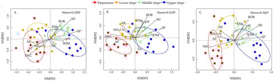 Non-metric multi-dimensional scaling (NMDS) ordination of 40 forest plots and environmental factors in karst peak-cluster depressions. (A) Herb layer; (B) shrub layer; and (C) tree layer. AP, available phosphorus; AK, available potassium; EMg, exchangeable magnesium; NH4+-N, ammonium nitrogen; pH, soil pH; SOM, soil organic matter; SWC, soil water content; SA, slope aspect; SD, slope degree; SP, slope position; ROR, rock outcrop rate.