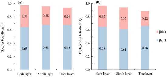 Species (A) and phylogenetic (B) beta diversity and their two components in the three layers. The data represent the average values of the replacement and richness components. Βrepl represents the sum of the replacement components; βrich represents the sum of the richness components for species or phylogenetic beta diversity.