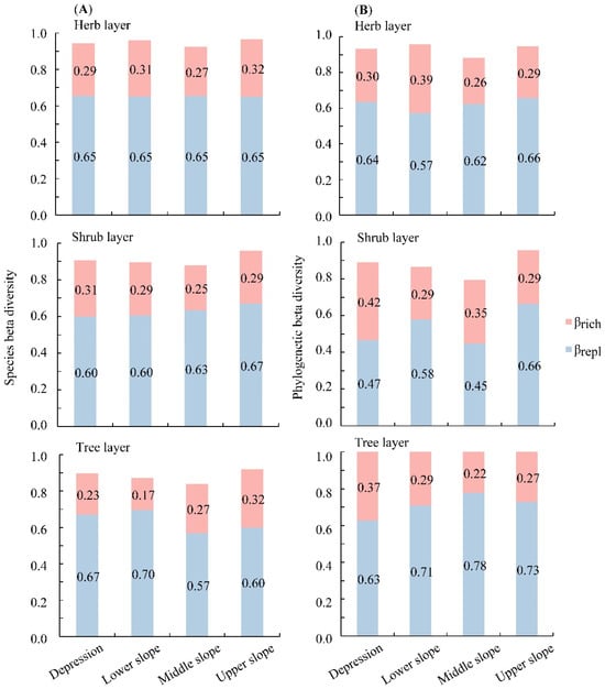Species (A) and phylogenetic (B) beta diversity and their two components in the different layers at different slope positions. Βrepl represents the sum of the replacement components for species or phylogenetic beta diversity; βrich represents the sum of the richness components for species or phylogenetic beta diversity.