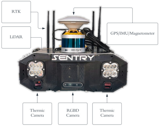 To determine its position, the robot may employ a global navigation satellite system (GNSS) sensor. However, each sensor has specific characteristics, such as its quality, noise level, and sensitivity to environmental conditions. Therefore, a system integrating multiple sensors with sensor fusion must be capable of handling these uncertainties and providing reliable and robust information [20]. In Figure 2, the developed system, named Sentry, is depicted.