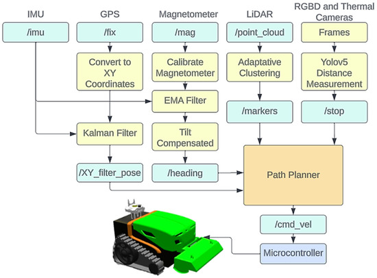 In Figure 3, the Inertial Measurement Unit (IMU) sensor, which has 6 Degrees of Freedom (6DOF), an accelerometer, and a gyroscope, is used to obtain information about the tractor’s behavior. This type of sensor provides information that has been directly acquired, meaning that these data have not been modified, formatted, or processed [23]. Before being used for analyses or other purposes, the data needs to be organized, cleaned, and processed. This type of processing may include noise elimination, error corrections, data format conversions, and transformations of data into structures that are more suitable for future analyses [24]. IMU data were input into a Kalman filter along with GPS coordinates (lat, lon) which were converted to (x, y) to obtain a position in (x, y) with minimal error variation. These IMU data are also used with magnetometer data, after calibrating, in an Exponential Moving Average (EMA) filter to obtain an orientation with tilt compensation.