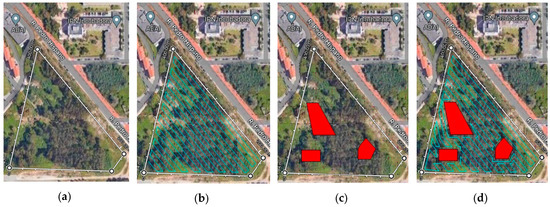 Representation of the choice of the area. (a) Area selection. (b) Path creation. (c) Restricted areas. (d) New path.