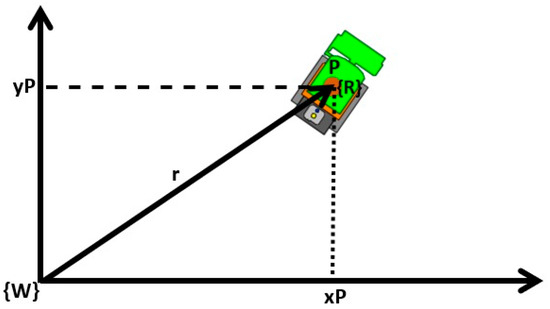 While a robot operates in each location, its actions are intrinsically linked to its precise location in that environment, including both its position and orientation. In a simple sense, a robot can be considered a rigid body, where its constituent parts maintain a constant relative position to each other and to the rigid body itself. Referring to Figure 6, we establish a coordinate system in a reference frame (W), serving as the starting point for the robot’s navigation. Let us assume that the robot is located at the reference point P, with a new coordinate system (R). In this way, the vector r represents the displacement between the coordinate systems (W) and (R) located at point P. This coordinate system can be defined in either polar or Cartesian coordinates.