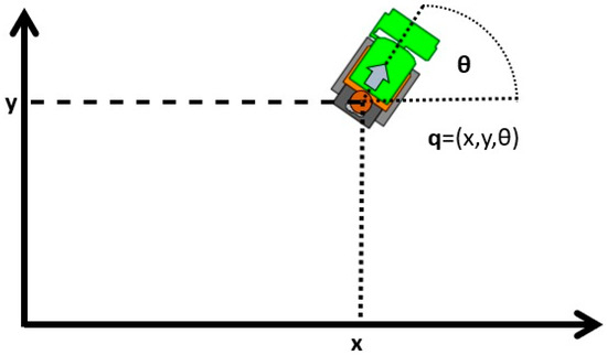 The robot’s position concerning the coordinate system (W) is described by the combination of the position (x, y) and the orientation angle θ for the coordinate axes. The forest machine used is a differential-drive robot, and its configuration in a two-dimensional coordinate system is defined by the robot’s position along the (x, y) axes and the orientation angle θ concerning the coordinate axes as shown in Figure 7.