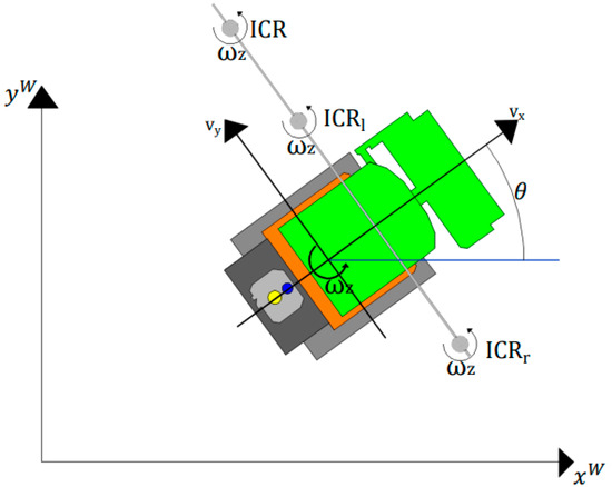 It is important to emphasize that this definition is associated with the point on the ground where the tracks contact the surface, rather than the rolling axis of the tracks themselves. The local reference coordinates for the vehicle’s ICR and the ICRs of the tracks can be geometrically determined through the following functions [30]:
