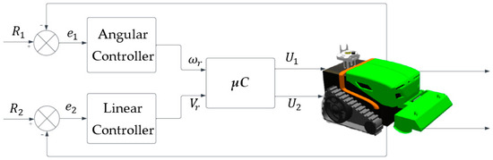 The robot’s control system is of the MIMO (Multiple Inputs and Multiple Outputs) type. This tractor is particularly useful for meeting the specific needs of forestry operations due to the unpredictable and variable nature of these environments. When working in forests, the terrain is often uneven and rugged, with natural obstacles that can hinder movement and maneuvering [8]. The control system consists of two main components: one component related to control types and another control component focusing on the “Microcontroller”. Due to the lack of knowledge about the speeds of each track, control is achieved by obtaining the position and orientation of the tractor. By utilizing information from various sensors in the system, both the position and orientation of the robot can provide linear and angular velocities. The input variables in this system are designated as references R1 and R2, as seen in Figure 8. These references are obtained using the tractor’s trajectory planning system and serve as input references for each of the controllers that manage the movement of each track. The control of the tractor tracks’ electromechanical valves is outlined as per Algorithm 1.