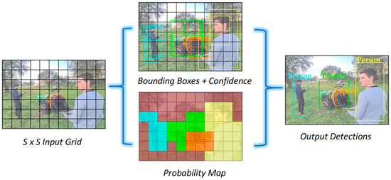 YOLO directly determines the location of bounding boxes for objects in the image, classifying each detected object and providing accurate information about the position and class of each identified element, as illustrated in Figure 11 [35]. Image information is used to project each bounding box, containing five values: coordinates, width, height of the box, and confidence associated with each detection. These values are related to a grid of cells covering the image, with each cell, located at the center of a bounding box, containing information on how to detect a specific object [36].