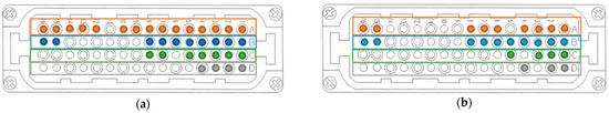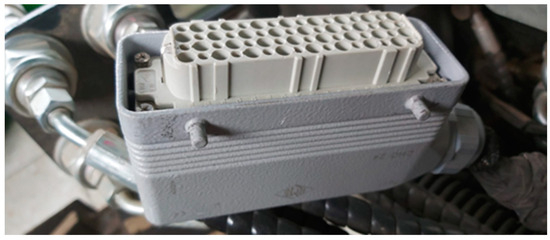 For the sensor system to be able to control the machine in question, the process began by testing all the inputs of the machine’s interface to understand the voltage and current values needed for each machine action. This means that depending on the voltage applied to the terminals of the tractor’s plug, it controls solenoid valves already present in the original tractor. Figure 14 shows the interface of the machine where these variables were measured.
