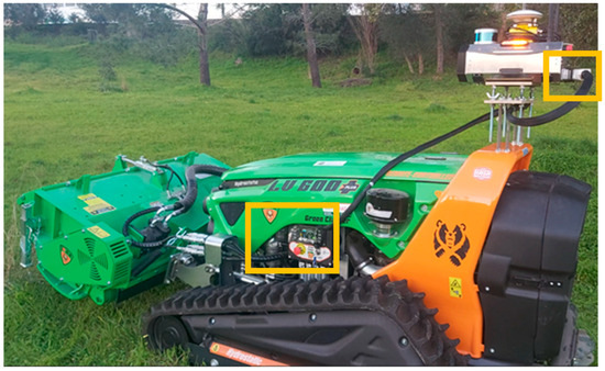 The robotic platform used in this work is a remotely operated and unmanned robot manufactured by MDB (Italy) [18], model LV600 Pro, depicted in Figure 1. This platform possesses a diesel engine to generate the hydraulic pressure required to power the attached tool and both the locomotion hydrostatic motors. An onboard CPU controls the electric valves responsible for operating the several functions of the robot. This is a common configuration for many forestry machines. One of the standout features of this machine is its ability to handle inclinations of up to 60° in all directions. It possesses a robust chassis, and a variety of modular tools can be coupled to it. In this work, a forestry shredder was used, motorized with a hydrostatic motor.