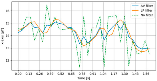 To assess the effectiveness of the filters, two sets of tests were conducted for each. The first set occurred under stationary conditions, while the second set during a state transition. The filters implemented are referred to as Low Pass Filter (LPF) and Exponential Moving Average Filter (EMAF). In the first test, parameters such as Maximum Absolute Error, Mean Absolute Error, and Variance were calculated. The objective was to keep the magnetometer (a sensor measuring Earth’s magnetic fields) at rest, without vibration or rotation, recording values over 0.3 s. In the second test, data acquisition took place during a state transition. For this, the magnetometer was manually rotated on a flat surface, covering approximately 120°, to observe the response to an impulse. Each rotation took approximately 1 s to complete. The purpose of these tests was to determine the most suitable order and cutoff frequency for the filter, aiming for a quick response, and identify the buffer size that best adapts to state changes. All tests were conducted in a laboratory environment, with the Duro Inertial positioned on a flat surface. In Figure 21, differences associated with the presence of a filter in receiving data from the magnetometer can be observed.