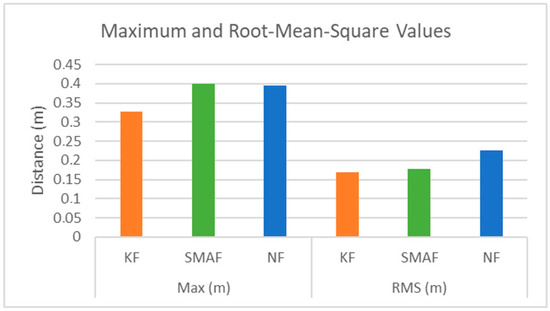 Not only for the magnetometer but also for the data received from the GPS, a filtering process was applied. The graph in Figure 22 provides a clear view of the superior performance of the Kalman Filter in filtering GPS data. Noticeably, there is a reduction in the maximum distance value concerning the reference trajectory when the filter is used compared to its absence. Additionally, the filter shows a lower RMS value, indicating higher reliability in the results. The SMA filter also exhibits a reduced RMS value, although not superior to that presented by the Kalman filter.