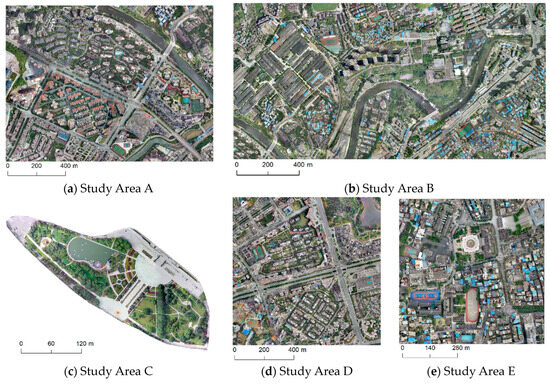 Zunyi City is located in the northeastern part of the Yunnan–Guizhou Plateau and the northern part of Guizhou Province, with a subtropical monsoon humid climate and complex vegetation types. In this research, five areas with high vegetation coverage in the built-up area of Zunyi City were selected as the study areas, i.e., study areas A to E in Figure 1. Study areas A (area: 80.8 ha), B (area: 200.0 ha), and C (area: 28.5 ha) contain residential areas, schools, factories, squares, parks and commercial centers, etc., which have a high degree of vegetation coverage and are rich in species to meet the needs for model training, and therefore were used as the training areas for model training and validation. Study area D (area: 100.2 ha) is basically the same as the training area in terms of its coverage of vegetation and features, so it was used as the test data to evaluate the classification accuracy. Study area E (area: 49.1 ha) belongs to the old city; the vegetation coverage is more different, and was used for the model migration test.