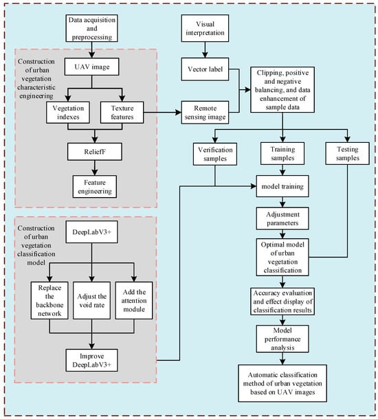 This research proposes an intelligent classification method for urban vegetation, and its flowchart is shown in Figure 2. Firstly, the collected data were preprocessed to generate a UAV mosaic, and the feature engineering is stacking by this image data and remote sensing feature screening algorithm. Then, the urban vegetation sample dataset was constructed by combining the UAV remote sensing image data with the feature engineering. Subsequently, improvements based on the DeepLabV3+ framework and the urban vegetation sample dataset were used to train the improved DeepLabV3+ model. During the training process, the parameters were adjusted according to the convergence of the loss functions of the training samples and the validation samples. The optimal model was selected for accuracy evaluation on the test set, and the model’s performance is analyzed via the classification effect diagram, finally realizing a precise and accurate classification method for the UAV.