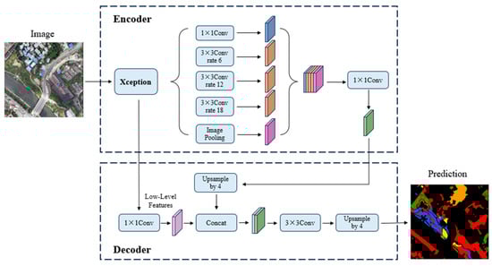 DeeplabV3+ is a deep learning network dedicated to the task of semantically segmenting images, and the overall structure of the network is shown in Figure 3. DeepLabV3+ continues the structure of the encoder and decoder, but optimizes the network structure. Xception and the ASPP module with atrous convolution were introduced into the encoder of this network to extract image features [34]. In this, null convolution inserts null values at intervals inside the convolution kernel through a preset null rate to expand the receptive field, and the high-level features of the image are obtained by performing different scales of pooling operations on the image features through the ASPP module. Subsequently, these high-level features enter into the decoder after up-sampling, and are fused with the low-level features to form the final feature representation. Finally, the final segmentation result is obtained by reducing the image size through up-sampling [35]. The structure under such optimization can capture contextual information at different scales in the image, enhancing the model’s ability to understand local and global information [36], and at the same time mitigate the problem of feature loss, which is beneficial in dealing with complex feature information in urban senses.