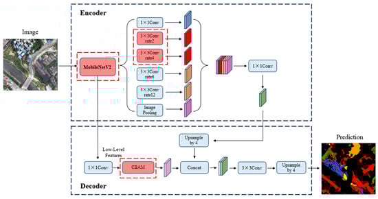 Although the DeepLabV3+ network has high edge segmentation accuracy and the ability to integrate multi-scale information, the structure of its network is more complex and requires a large amount of computational resources; this restricts its efficiency in performing fine feature classification. In order to achieve the high-precision and high-efficiency remote sensing classification of urban vegetation, this research improved and optimized the DeepLabV3+ network structure, used MobileNetV2 as the backbone feature extraction network and modified the null rate of ASPP, and added the attention mechanism convolutional block attention module (CBAM) in the decoding stage. Figure 4 shows the improved network structure.